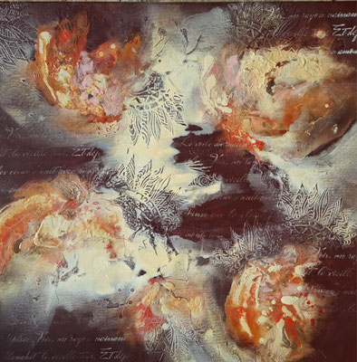 Mit Acrylfarben, Strukturpaste, Pastellkreiden, Schellack und Schablonen